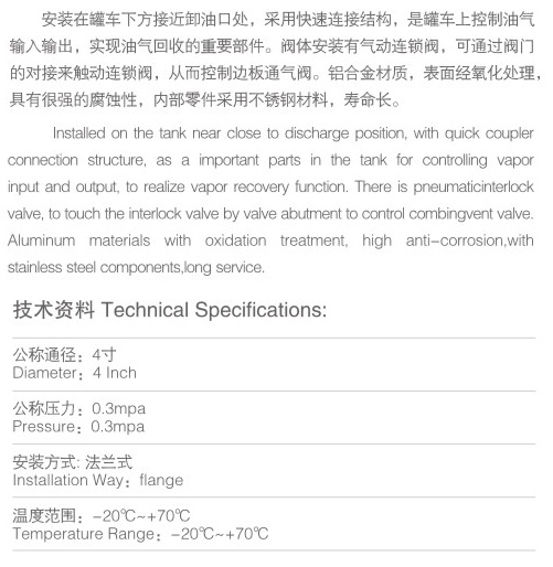 油氣回收快速接頭安裝于地面與排氣管連通,油罐車在卸油時,透過與快速接頭連接膠管,將儲于地下油罐的油氣回收到油罐車內。