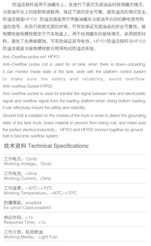 防溢流系統(tǒng)由防溢流探桿和防溢流插座組成是專為油罐車裝油設計的,當罐內(nèi)液位到達探測點時,探桿的信號中斷,加油控制系統(tǒng)從而停止裝油。
